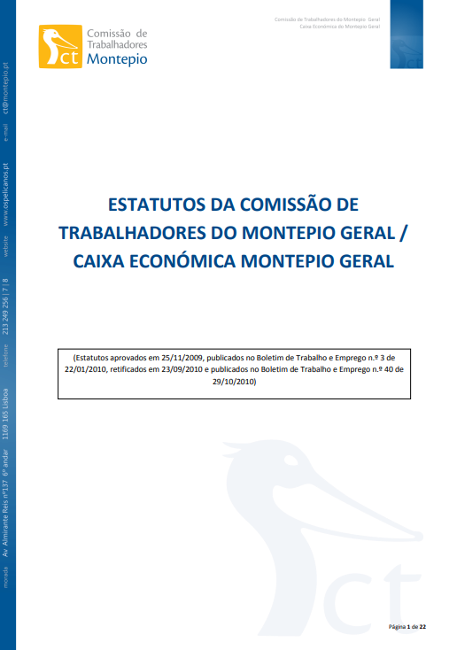 Os Estatutos da Comissão de Trabalhadores definem as competências e regras de funcionamento, garantindo uma atuação transparente, democrática e alinhada com os valores de ética, responsabilidade e cooperação que caracterizam o Banco Montepio.